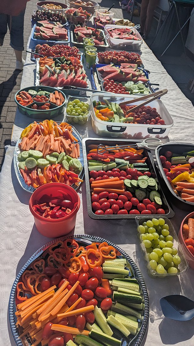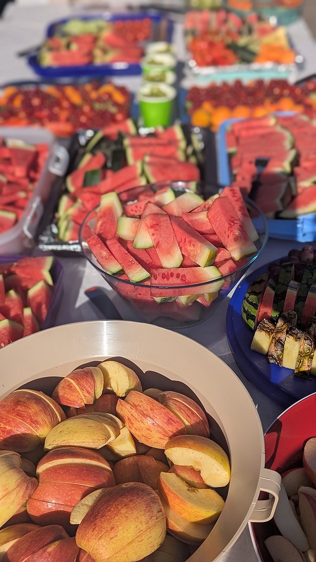 Der Förderverein hat unsere fleißigen Sportler mit einem Sportlerbuffet unterstützt. Die Tische waren ein wunderbarer Anblick mit einer großen Auswahl unterschiedlicher Früchte und Gemüse. Das Buffet lieferte nicht nur wichtige Energie, sondern zeigte auch, wie sehr sich der Förderverein um das Wohl und die Gesundheit unserer Schüler kümmert.