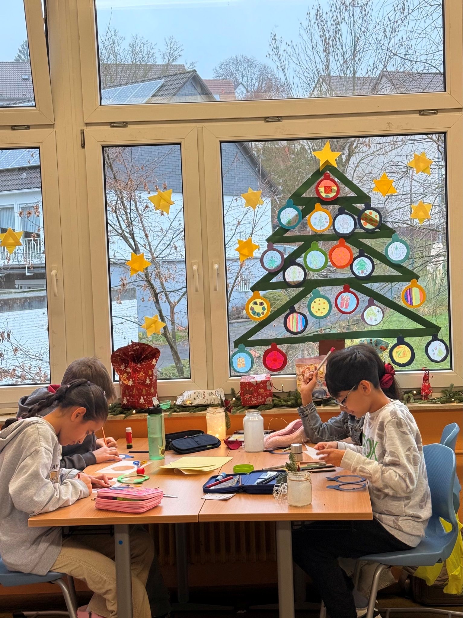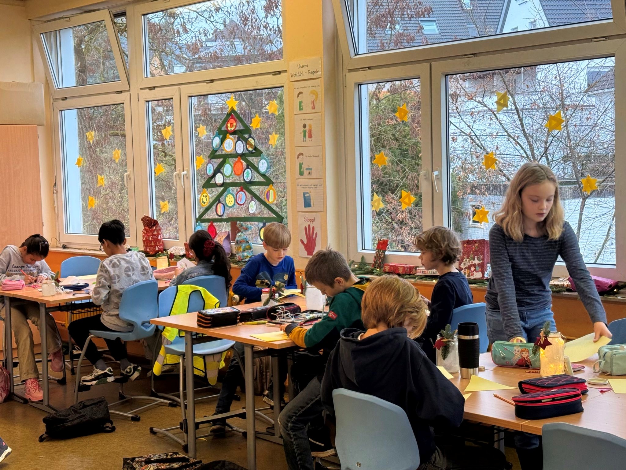 Mit Unterstützung einiger Eltern entstanden liebevoll gebastelte Sterne, Fensterbilder, Papierkränze und kleine Kunstwerke aus Naturmaterialien. In allen Räumen wurde geschnitten, geklebt und gemalt – begleitet von Adventsmusik.