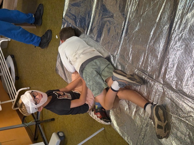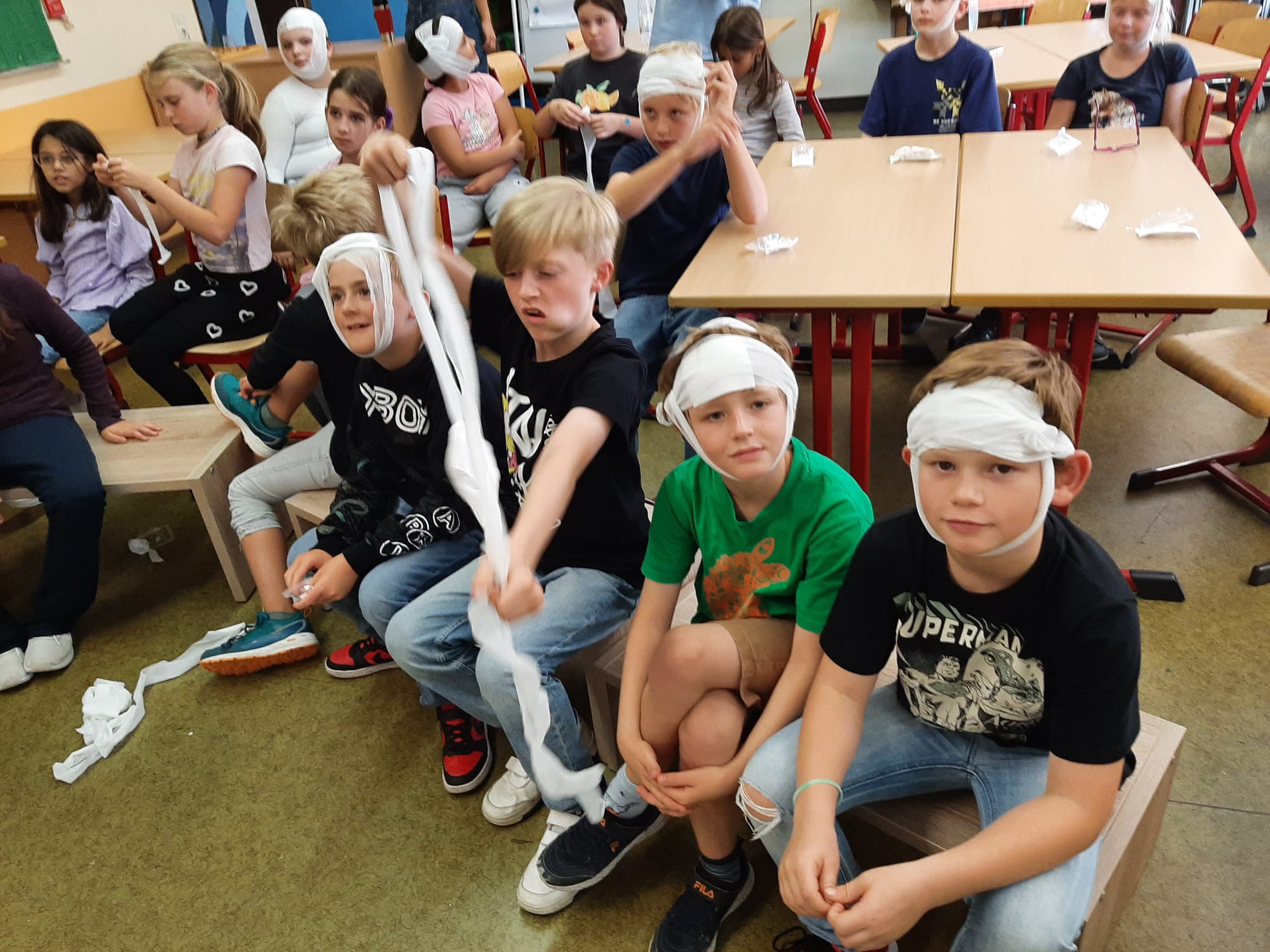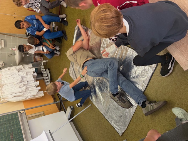 Während unserer Unterrichtsreihe im Sachunterricht „Mein Körper“, kam im Klassenrat der Wunsch nach einem professionellen Erste-Hilfe-Kurs für Kinder auf. Gesagt, getan! Die Erstehilfeschule Wuppertal (www.erstehilfeschule-wuppertal.de) von Lars Petig wurde engagiert, um uns kompetent, praxisnah und anschaulich die TOP 5 der Ersten Hilfe beizubringen: