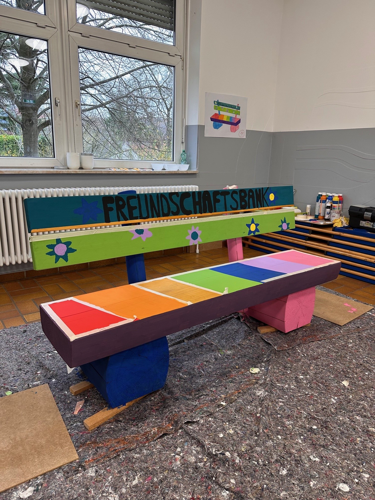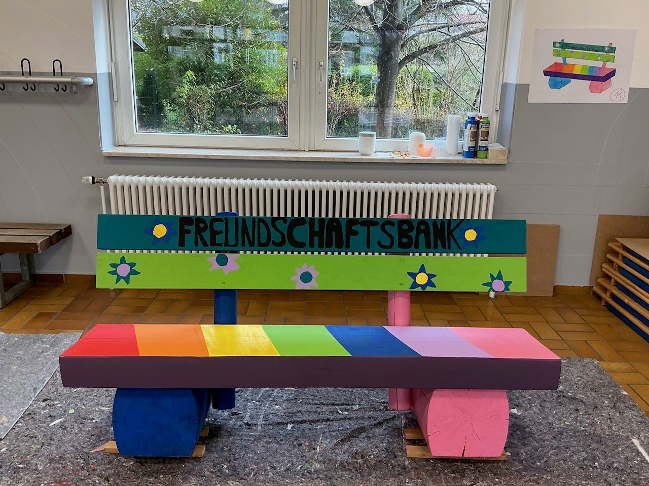 Für unsere Schule gibt es einen besonderen neuen Platz: eine leuchtend bunte Freundschaftsbank, gespendet vom Rotary Club. Die Bank soll Kindern helfen, schnell Anschluss zu finden, wenn sie sich allein fühlen oder jemanden zum Spielen suchen. Wer dort Platz nimmt, signalisiert: „Ich wünsche mir Gesellschaft.“ Andere Kinder werden ermutigt, darauf zu achten und zum gemeinsamen Spielen einzuladen.